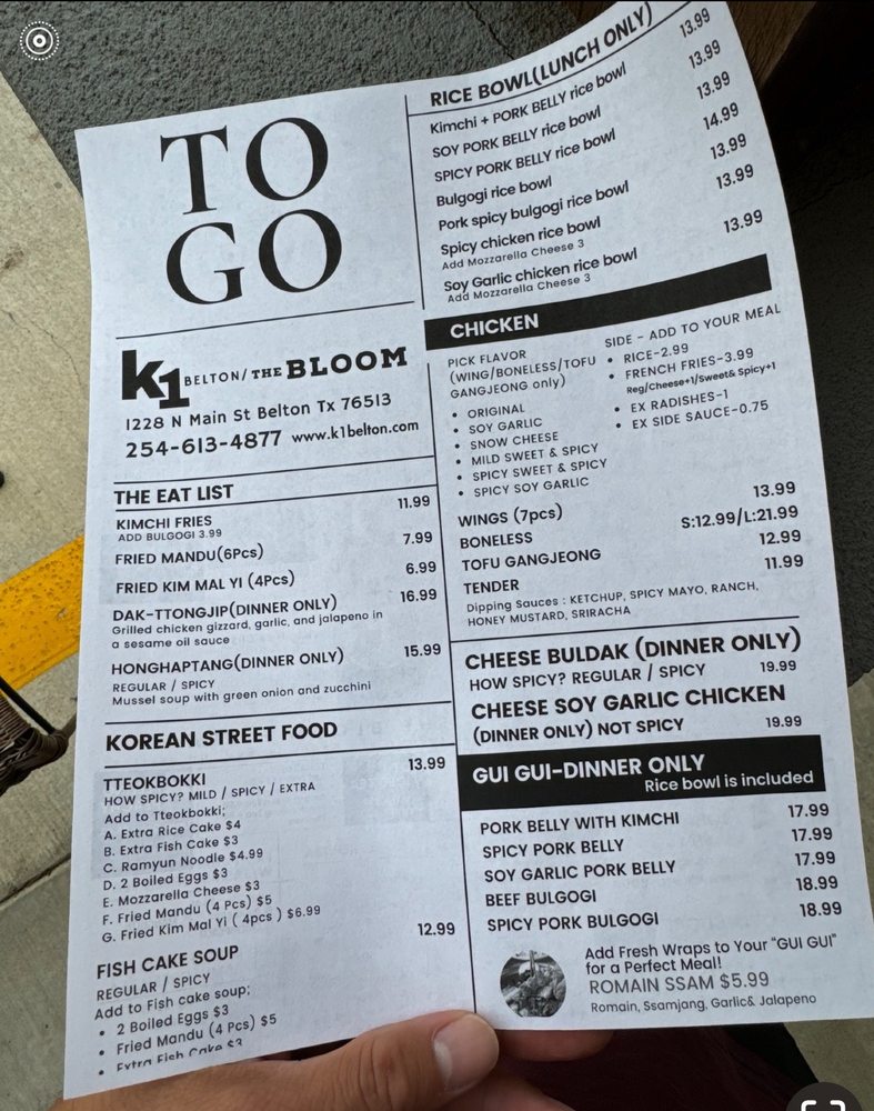 Welcome to K1 Belton The Bloom, a lively Korean dining experience nestled in Belton, TX. Located at 1228 N Main St, this vibrant eatery offers an inviting atmosphere ideal for families and dog lovers alike. Customers rave about the prompt service and innovative menu, featuring a delightful blend of traditional and modern Korean dishes.
